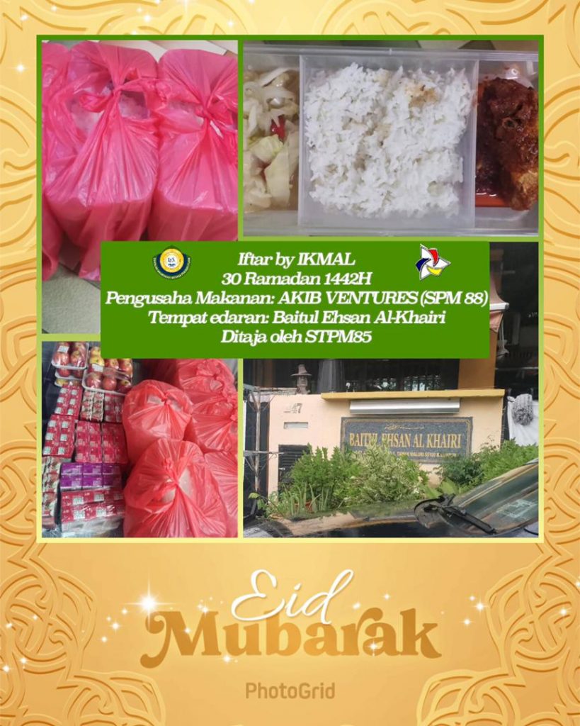 Iftar by IKMAL 30 RamadhanMay 12, 2021adminNewsAlumni, Iftar, Kebajikan12/05/2021 (30 Ramadhan) Nama pengusaha makanan: AKIB VENTURES SPM88 Menu & bilangan edaran: Pek nasi Tempat edaran makanan: Baitul Ehsan Al-Khairi Jumlah kos: ditaja STPM’85